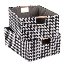 ANMINY 2피스 보관함 세트 접이식 면 리넨 원단 오픈 보관 바구니 상자 나무 손잡이 하운드투스 격자 무늬 장식 아기방 아기 어린이 옷 타월 세탁 용기 – 블랙 미디엄, Black_Medium