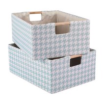 ANMINY 2피스 보관함 세트 접이식 면 리넨 원단 오픈 보관 바구니 상자 나무 손잡이 하운드투스 격자 무늬 장식 아기방 아기 어린이 옷 타월 세탁 용기 – 블랙 미디엄, Light Blue_Medium